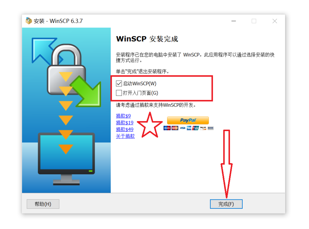 选中“启动 WinSCP”,并取消勾选“打开入门界面”。随后点击完成。